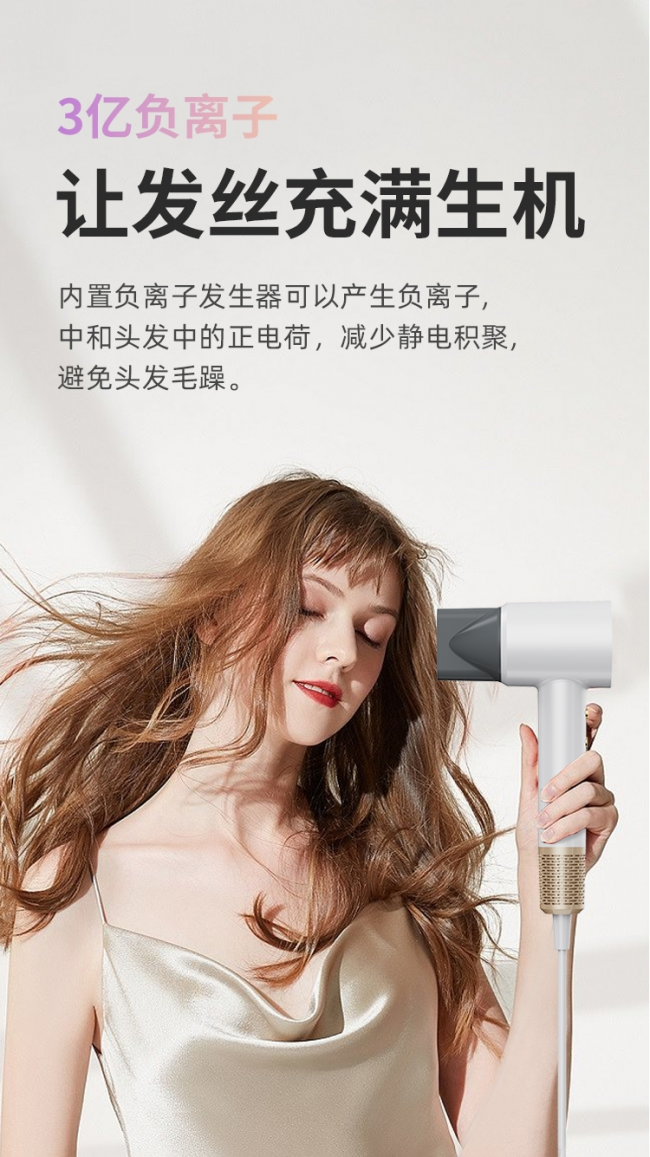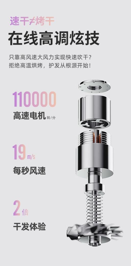 同時,高速吹風(fēng)機通過電子芯片的智能控制,可以實現(xiàn)精細的風(fēng)速調(diào)節(jié),每分鐘能輸出 19m/s 以上的大風(fēng)量,快速將頭發(fā)吹干,縮短使用時間,1分鐘即可吹干利落短發(fā),長發(fā)也僅需5分鐘,高效速干。